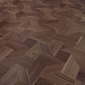 Parchet Chevron 45° din lemn de nuc american Ca’ Foscolo: periat, lacuit. Prelucrarile evidentiaza caracteristicile naturale ale lemnului.